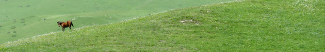 Kleinere Farbtupfer gibt es immer wieder. Sie tun gut. Ob es nun die Landschaft ist, die Blumen auf den vielen Bergwiesen oder ein Reiter in der angenehmen Mittagssonne. Wenn das Auge sucht, so findet es auch. So wechselt täglich grau mit bunt.