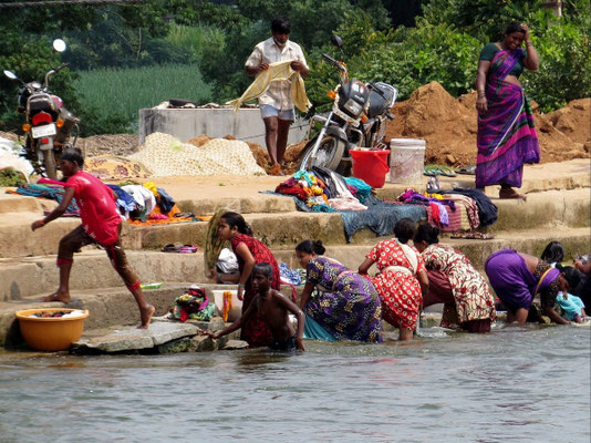 Hier wird in Kesseln die Wäsche sehr umweltschädlich vorgekocht. Alte Autoreifen und Abfälle der Schuhindustrie werden verschürt. Zum Schluss gelangt die Brühe in den Ganges. Die Wäscherinnen klopfen die Wäsche auf Steinen bis sie sauber erscheint. Arbeit bei den Wäschern, wäre auch nicht so mein Ding.